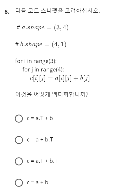 b를 전치(Transpose) 하면 브로드 캐스팅(BroadCasting)을 통해 계산이 될 것입니다.