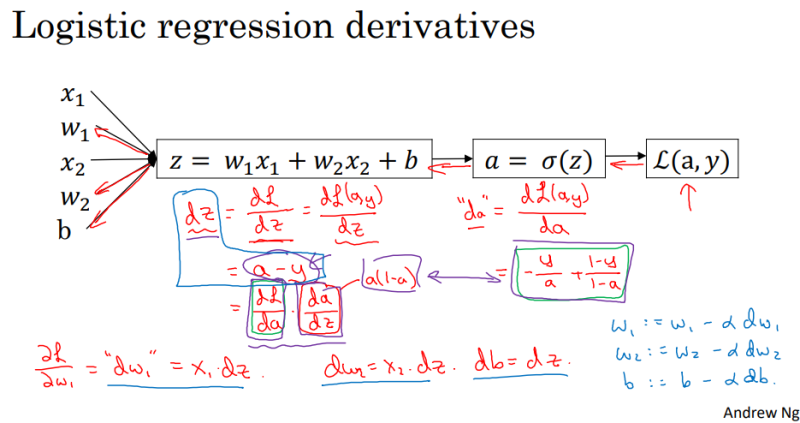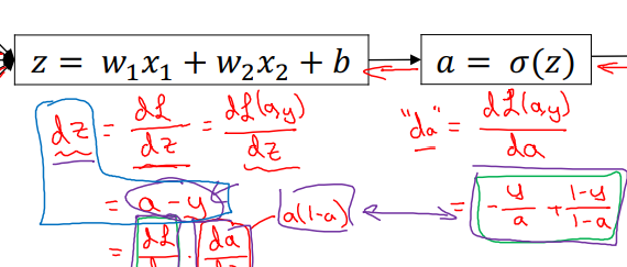 d L(a, y) / d z = a - y 가 되고, 코딩을 위해 d L(a, y) / d z를 변수 이름 dz로부르겠습니다.