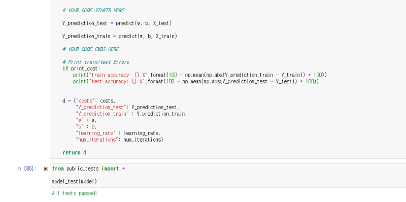 initialize(), propagate(), optimize() 각 함수를 별도로 구현했습니다. 그런 다음 model()을 구축했습니다.