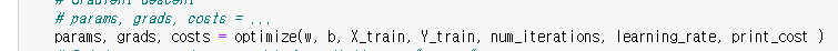 그다음으로 코딩해야 할 parms , grads, costs는 optimize() 함수를 불러서 작성합시다.