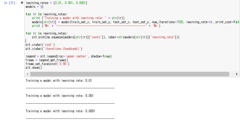 -- 비용 함수를 더 잘 최소화하는 학습률을 선택하십시오.