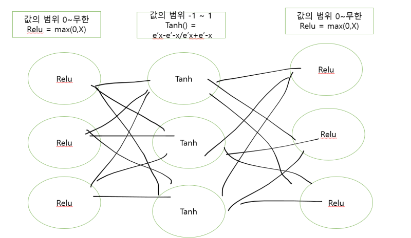 Relu 함수의 출력 값이 Tanh 함수의 입력값으로 입력되고,