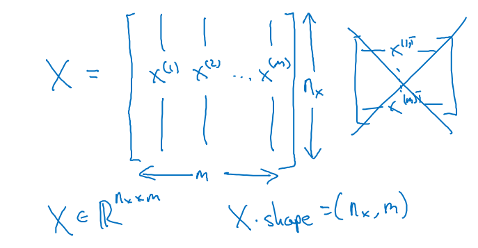 요약하자면, X는 Nx * m 차원 행렬이며, 이것을 파이썬에서 구현하면 X.shape()가 됩니다.